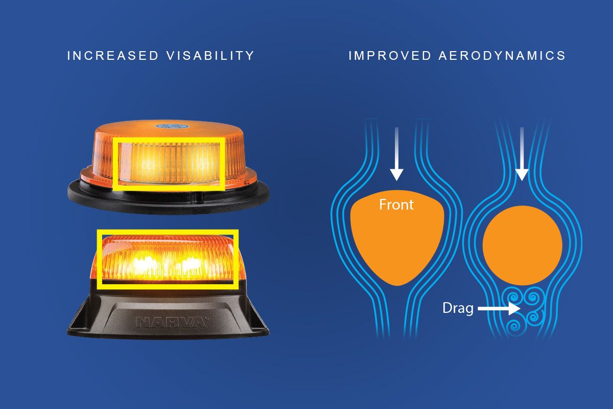 The trilobular shape of AeroTech allows for smoother airflow around the strobe, resulting in up to 60% less drag compared to round strobes. Whilst AeroTech is most aerodynamic with the flattest side facing forward, even with the pointed side forward, AeroTech still results in less drag than a round strobe. The benefit of this is less high speed wind noise while driving.