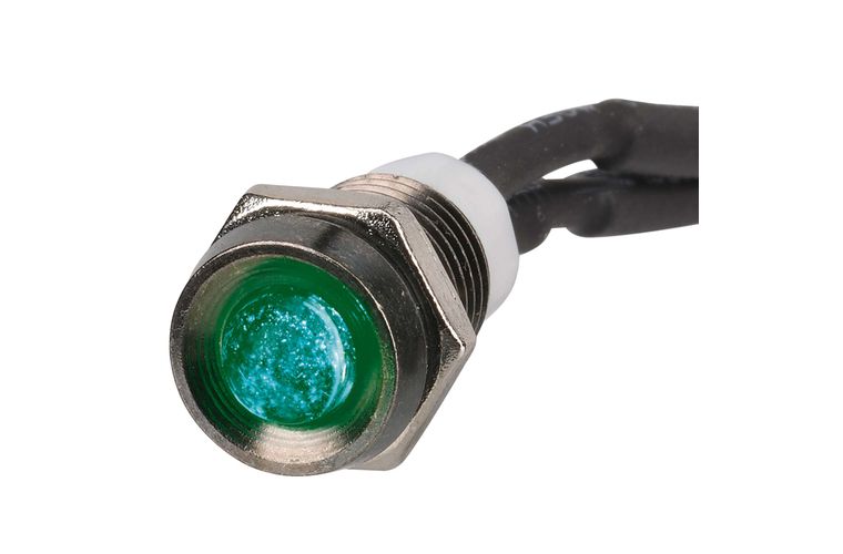 Coloured lens when on, clear lens when off. Pre-wired with 14mm lead. Mounting opening: 8mm diameter