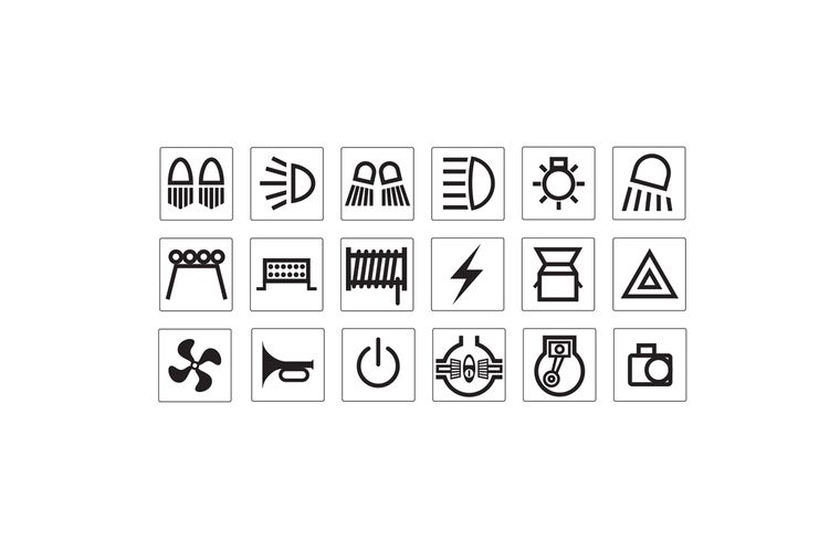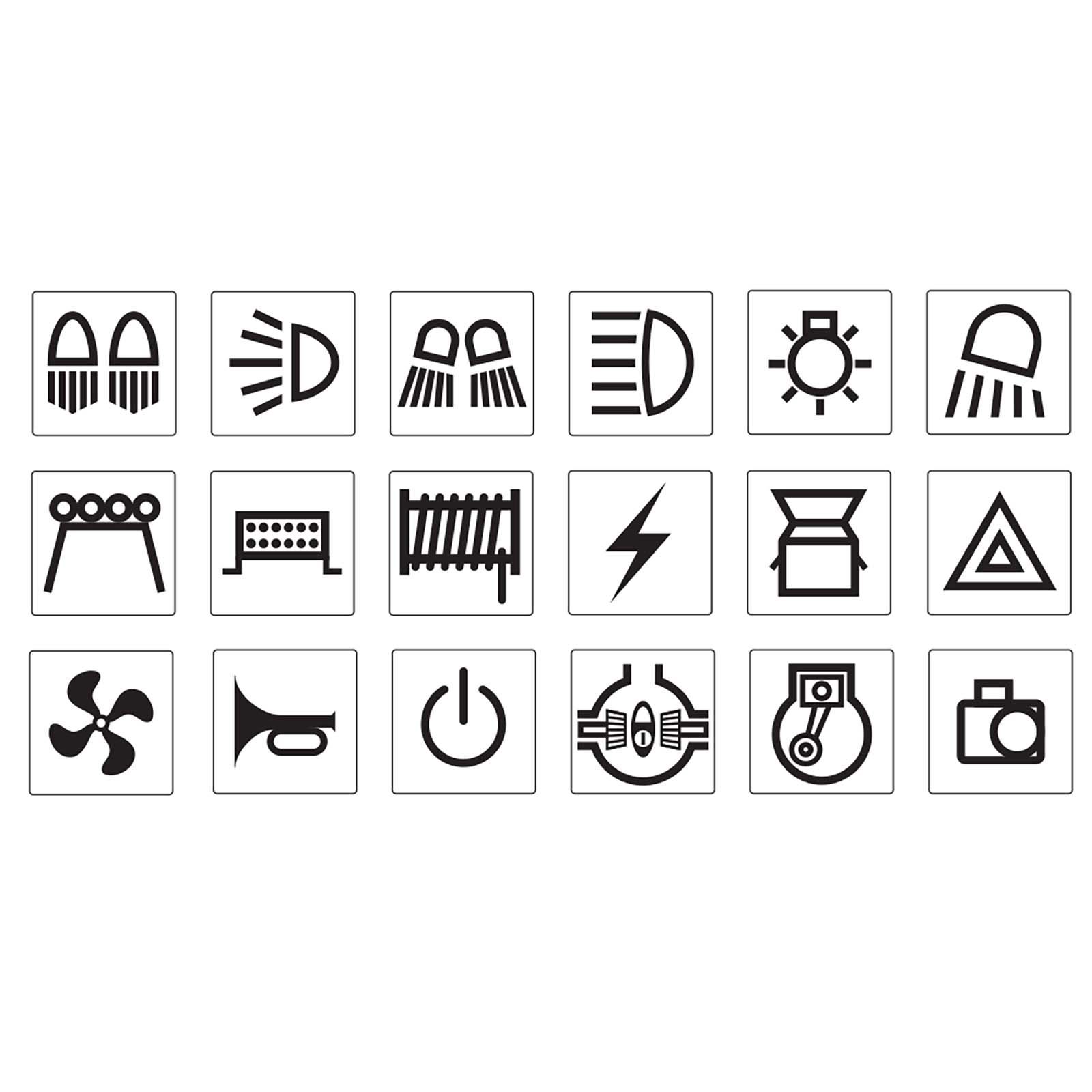 | COMPRISES | Includes symbols (pictured) & descriptions: off-road lights, backup lights, driving lights,; work lights, fog lights, spot lights, rock lights, aux lights, map light, roof lights, LED light bar,; Aux 1, 2 & 3, air compressor, 12V, fridge, front & rear diff lock, reverse camera, start, fan, winch, power, radio, horn, hazard warning; |